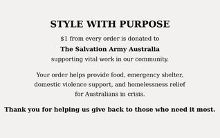AUD $1 from every order on Kyle’s Collections goes directly to The Salvation Army.